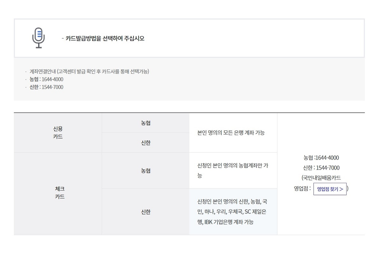 3. 카드 발급 방법 선택 : 카드 발급 방법을 선택합니다. 신용카드 또는 체크카드 중에서 선택할 수 있으며, 농협이나 신한은행을 통해 발급받을 수 있습니다.